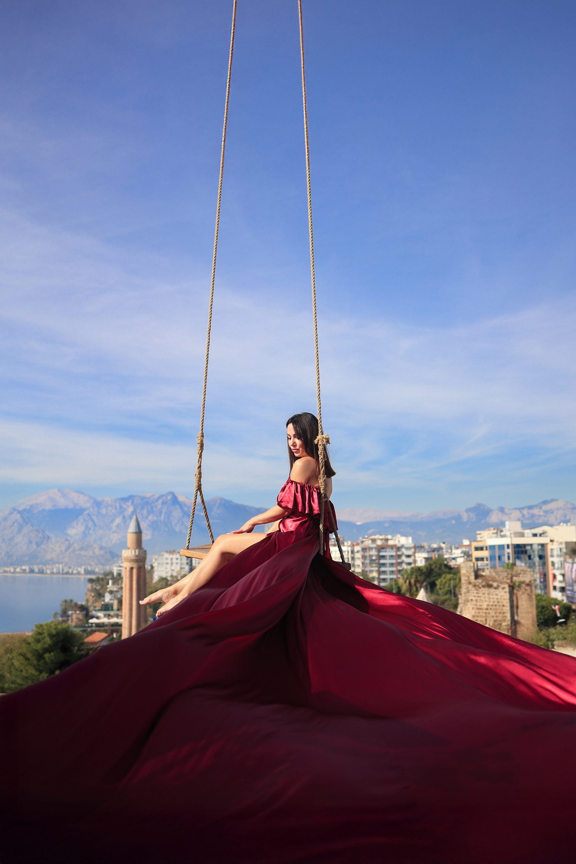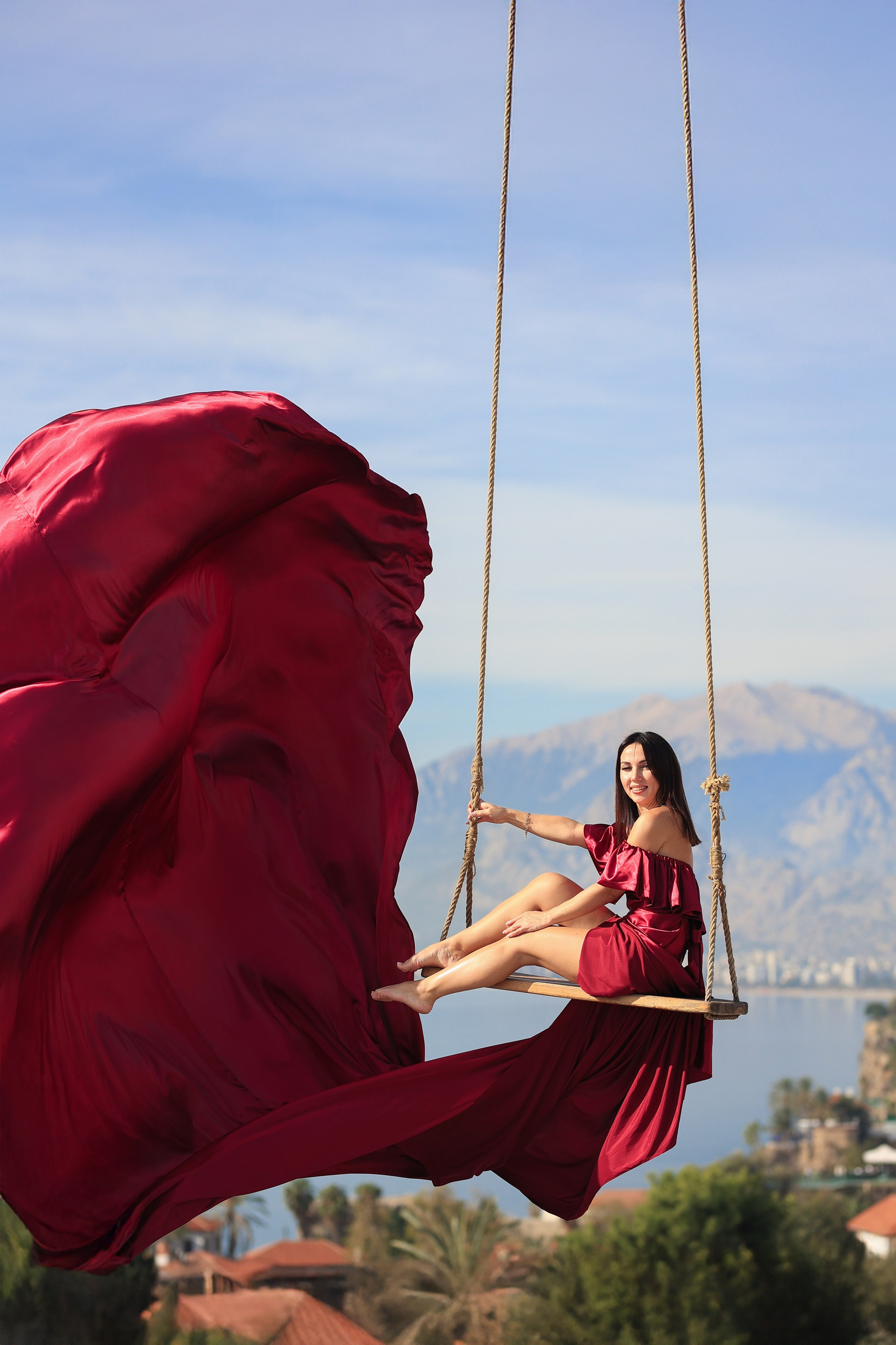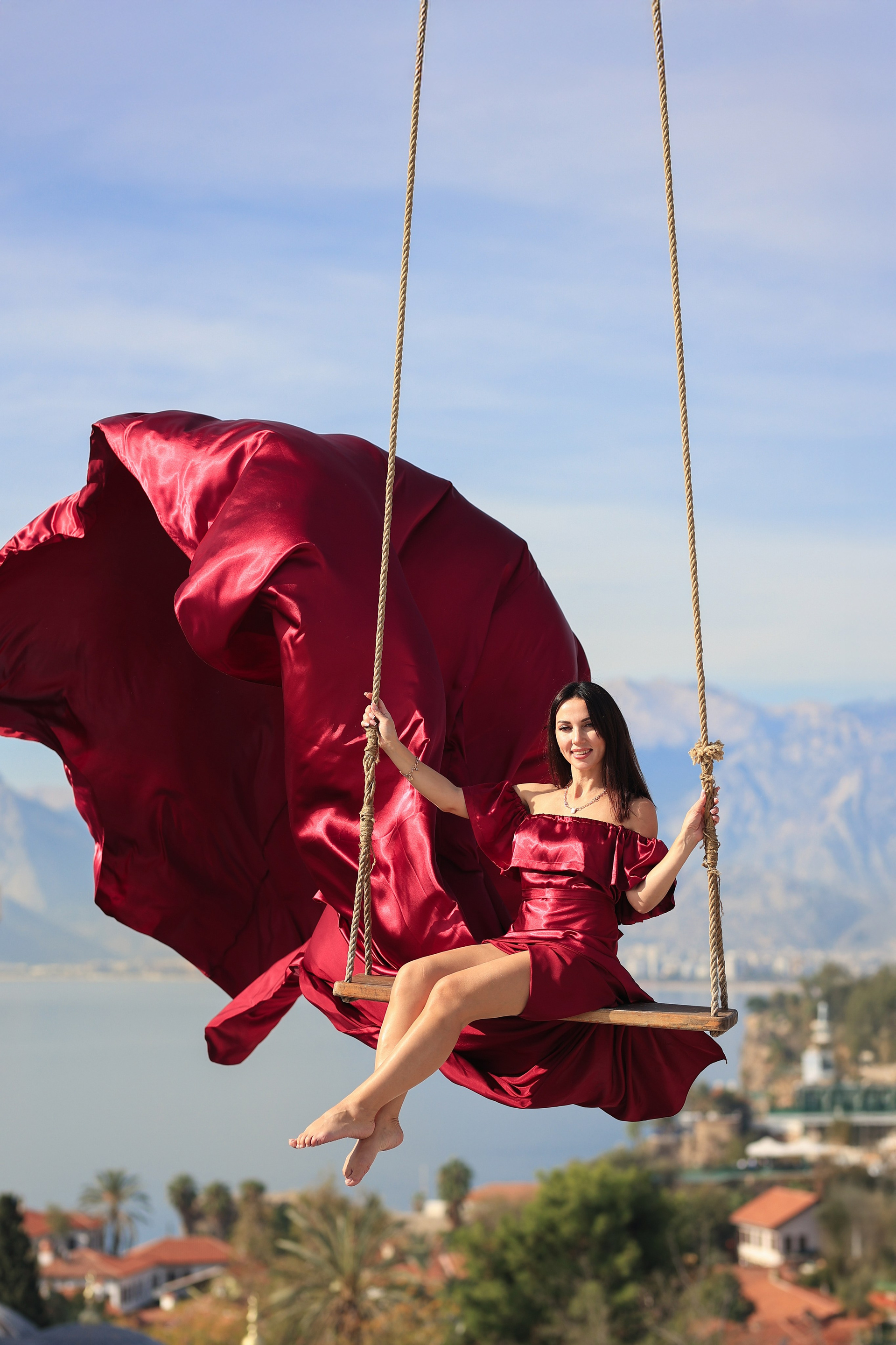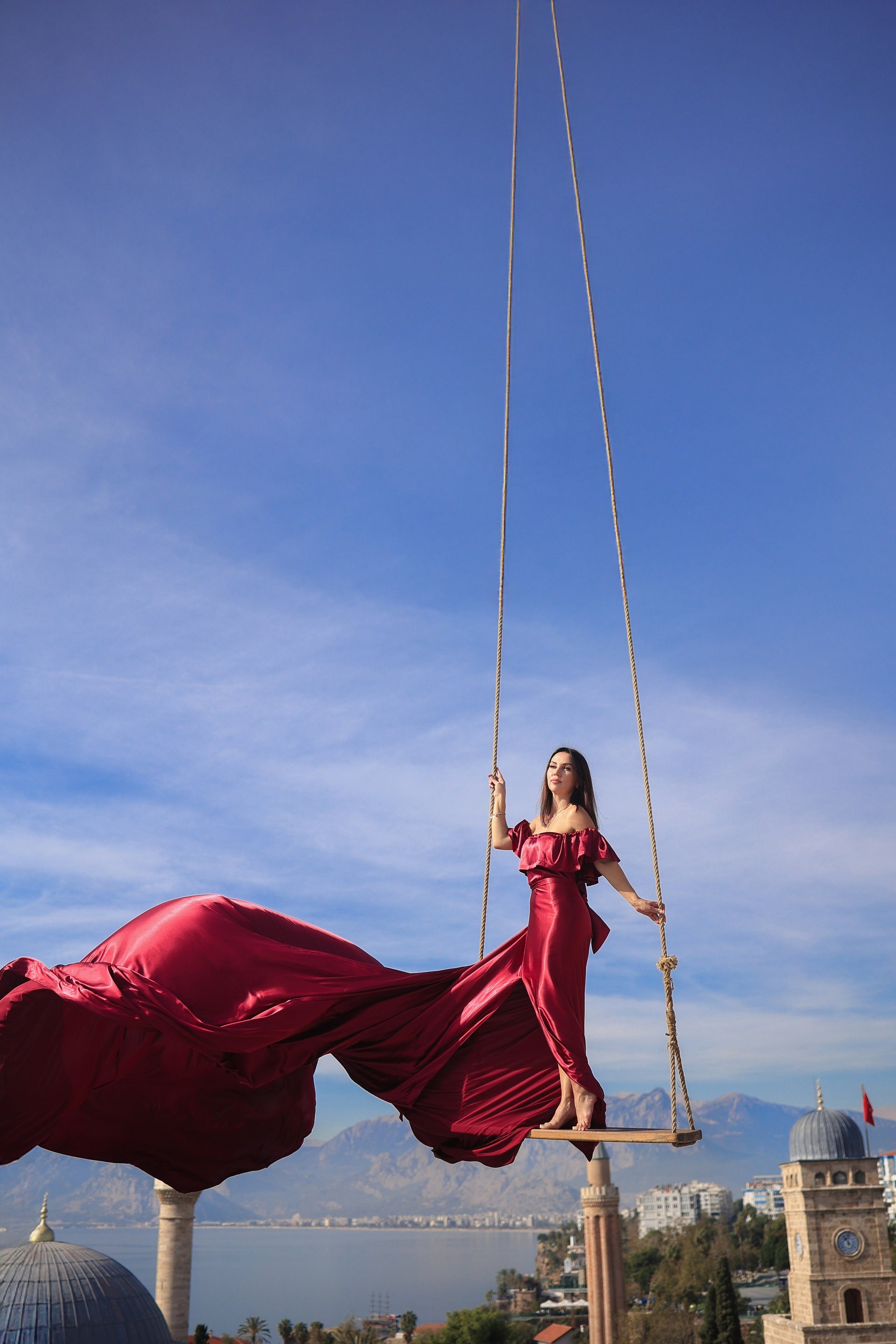 - Качели на фоне крыши и моря — лёгкость, ветер и невероятный кадр